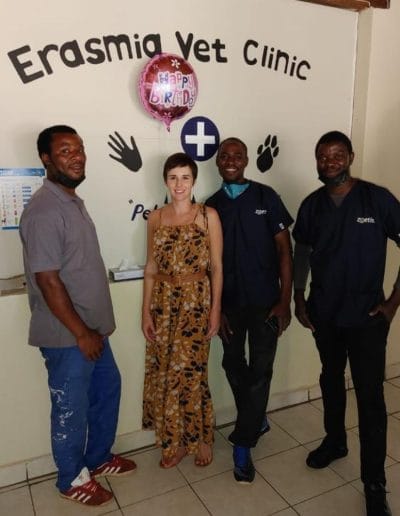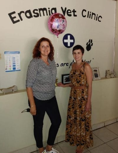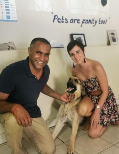 Clinic sweetheart; Amber is our clinic sweetheart who meets and greets the patients and owners. Amber was injured as a puppy and paralysed. After several months of treatment and a lot of TLC she is a happy and lively member of our Erasmia vet family.